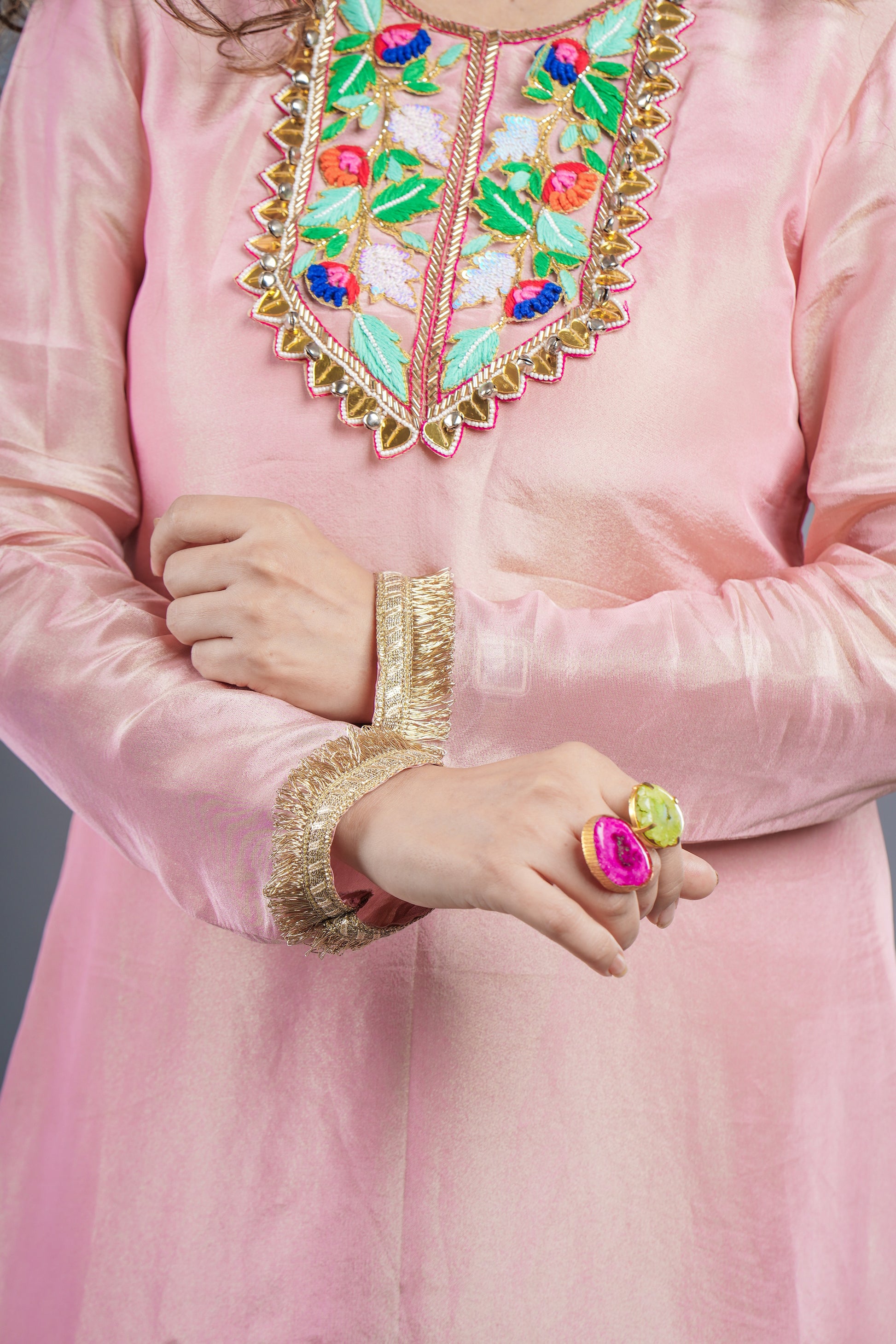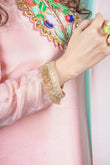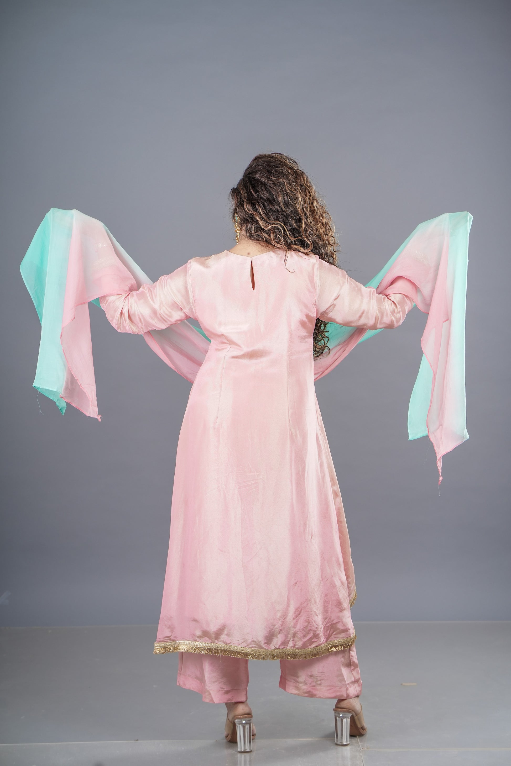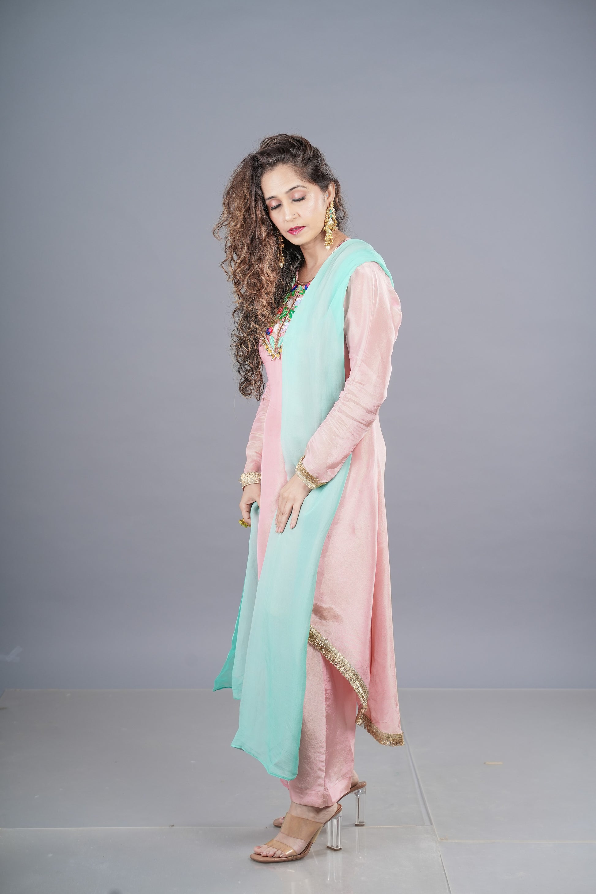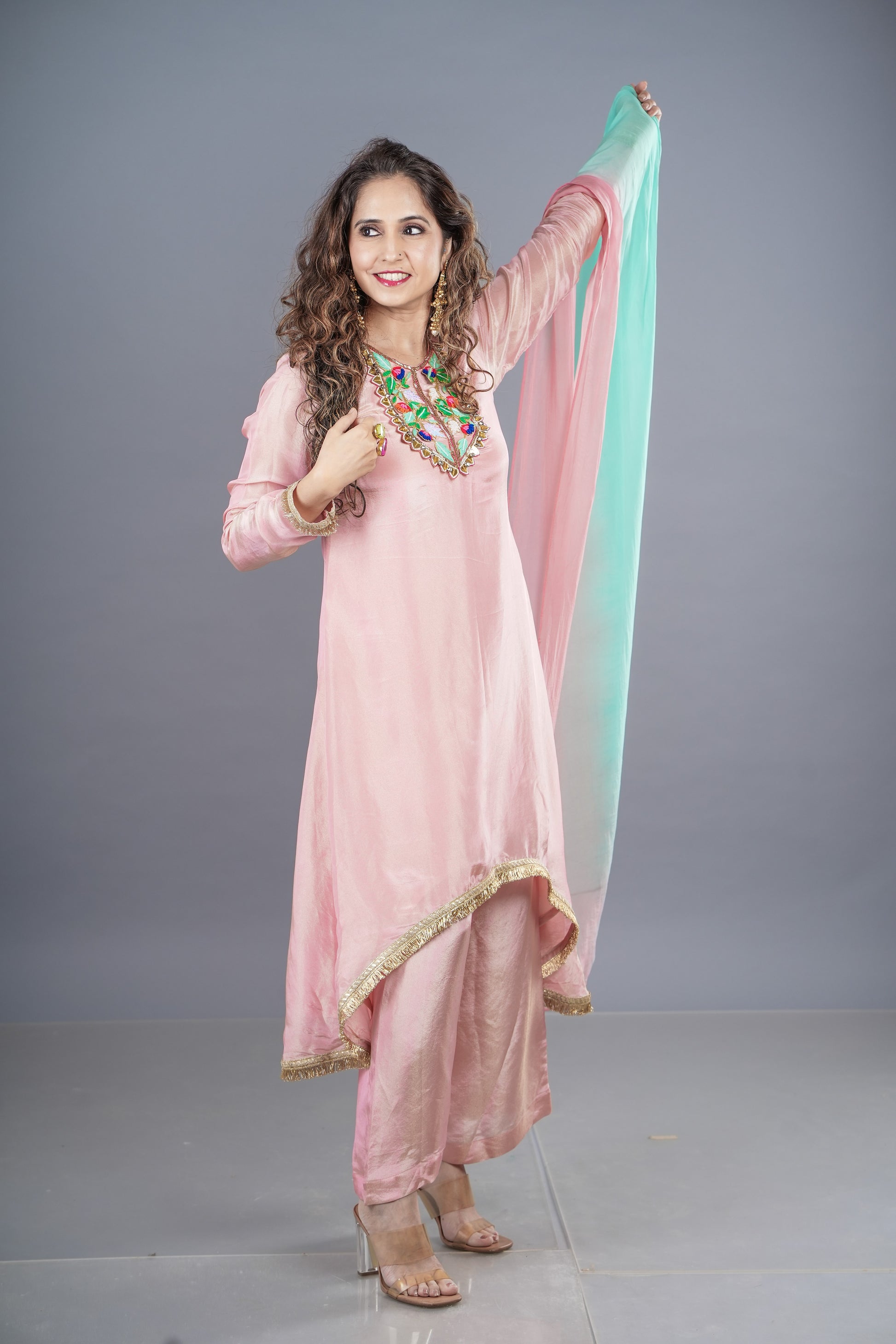 Ethereal in tissue fabric, this asymmetric beauty features intricate neckline handwork with resham and acrylic detailing. Paired with a dreamy shaded dupatta, it’s all about understated elegance with a hint of drama.