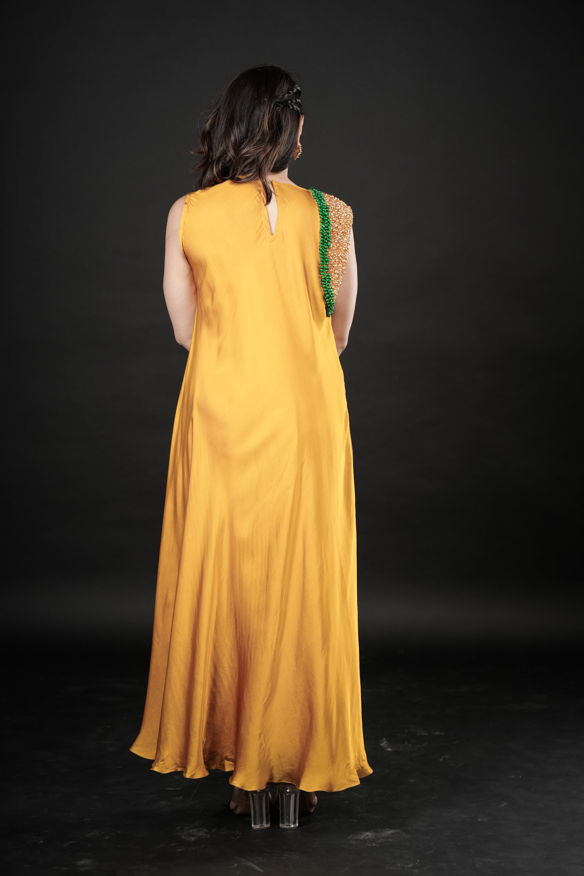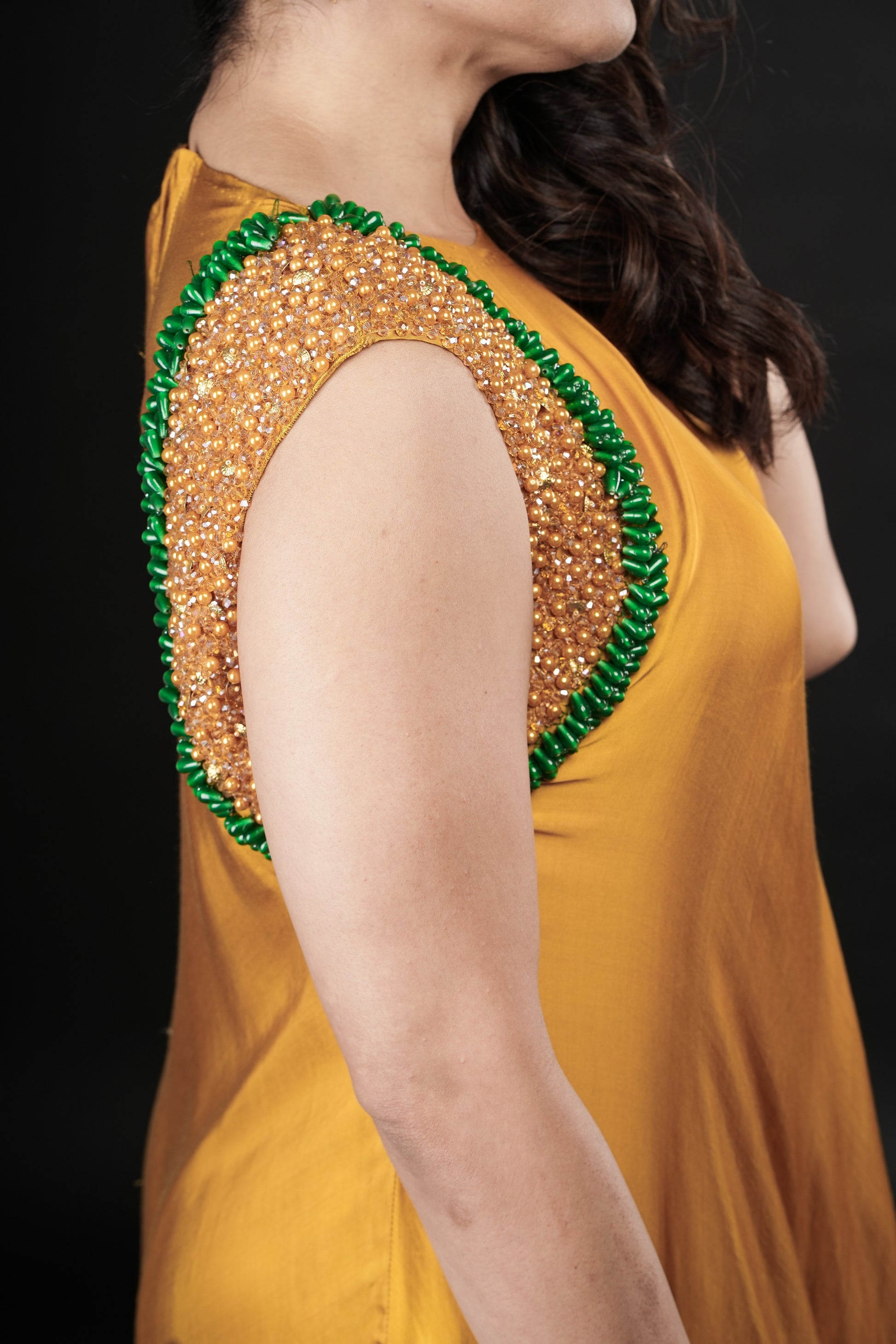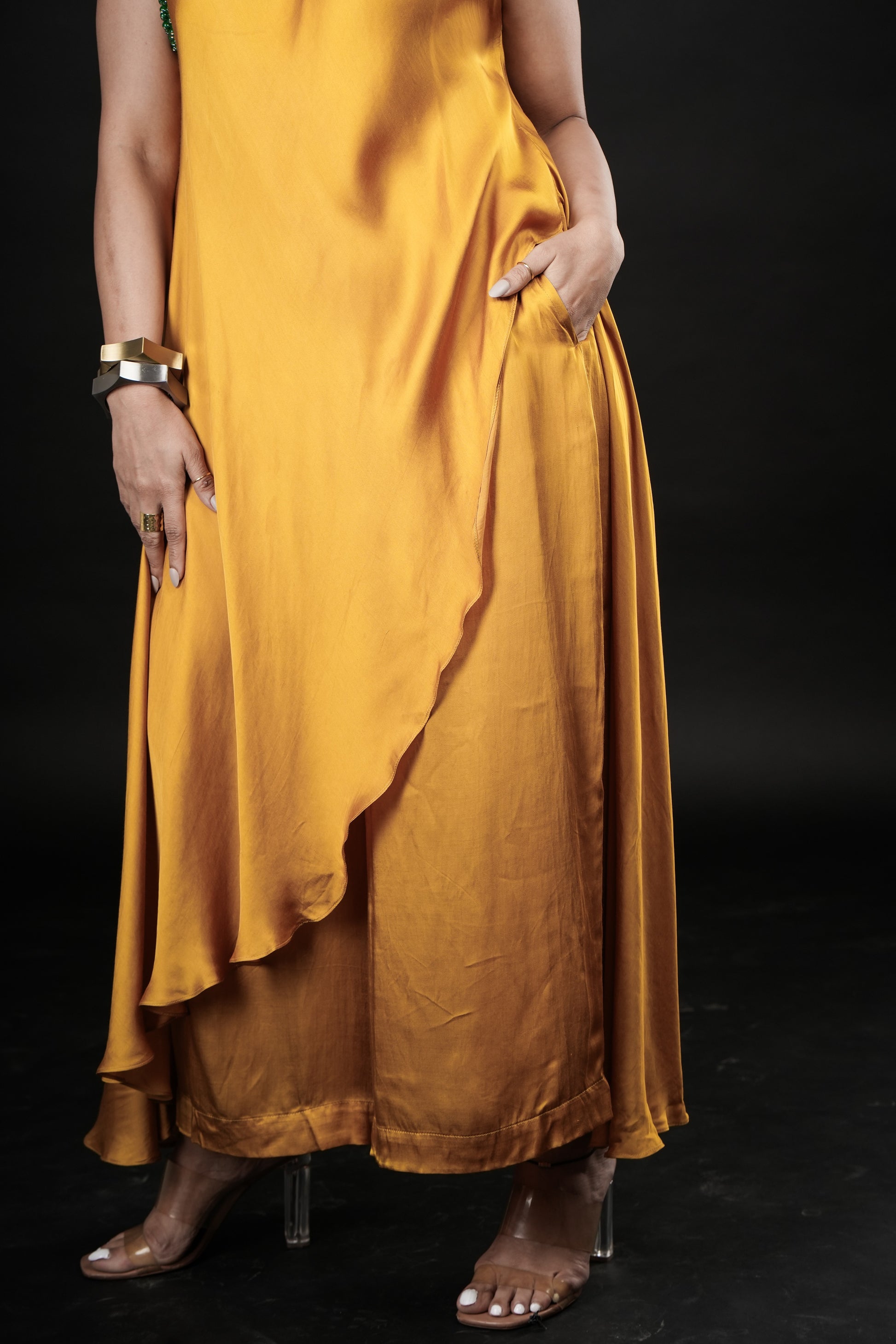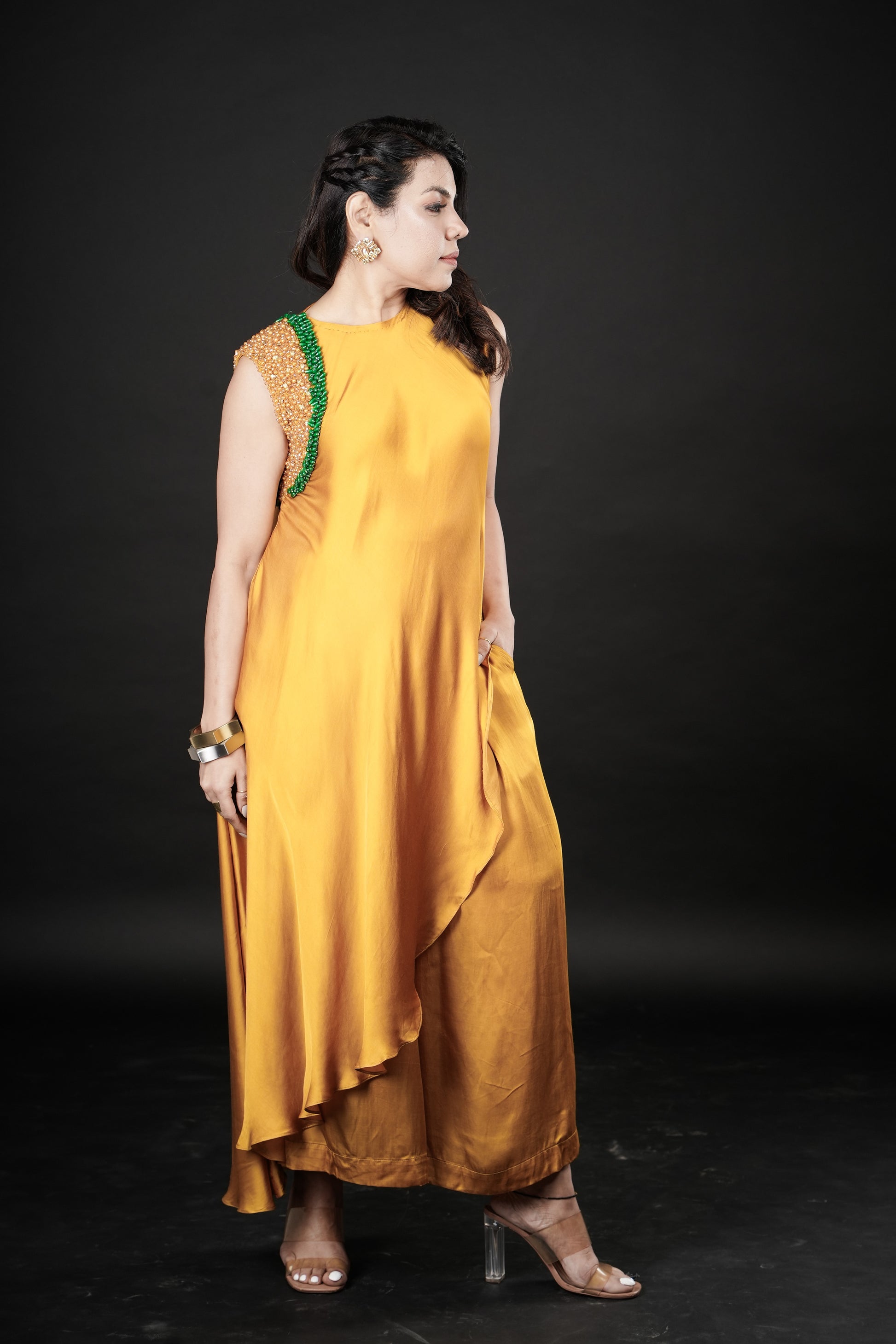 Turn heads in sunshine mustard — our modal satin coord set is all about that asymmetrical magic, adorned with intricate bead and crystal detailing. The one-shoulder design adds a dash of drama, making it your perfect statement piece for when subtle just won’t do.