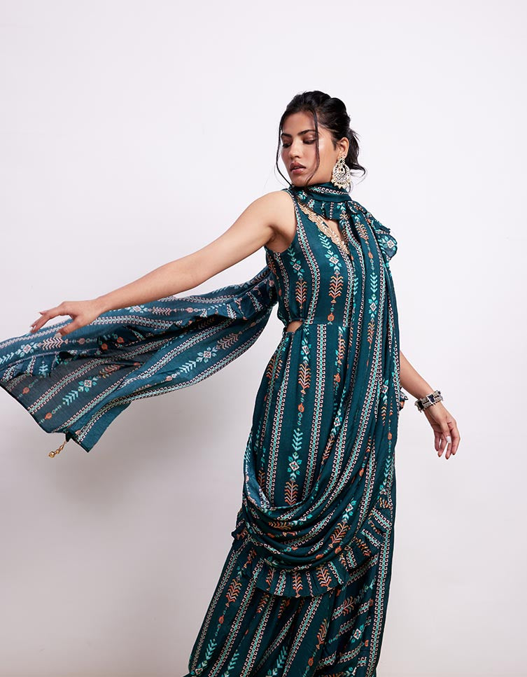 Prepare for compliments galore in our Jumpsuit Saree. With its super unique style and flawless fit, you'll have everyone asking where you got it from.